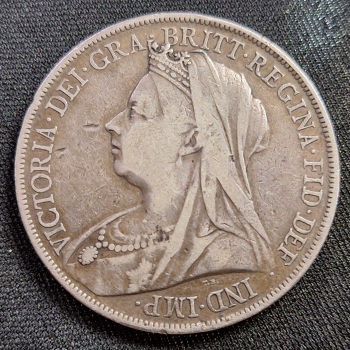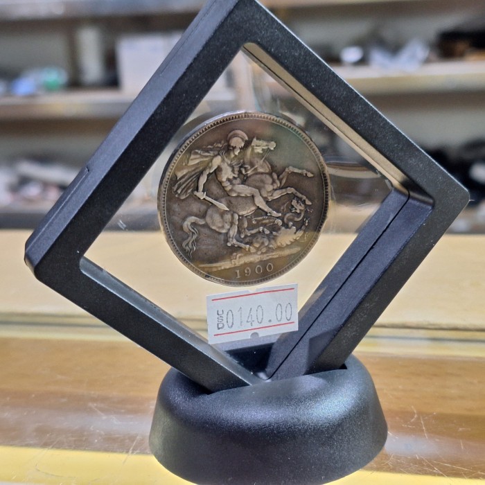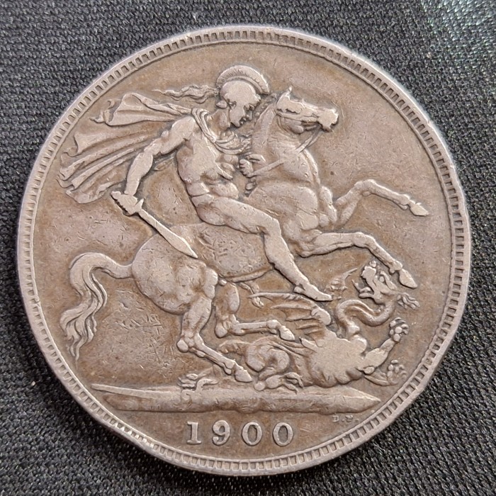 Tags: 1900 crown coin, Queen Victoria silver coin, UK crown 1900, Veiled Head coin, British silver coin, St George crown, antique coin, Victoria crown, British numismatic collectible, sterling silver coin,