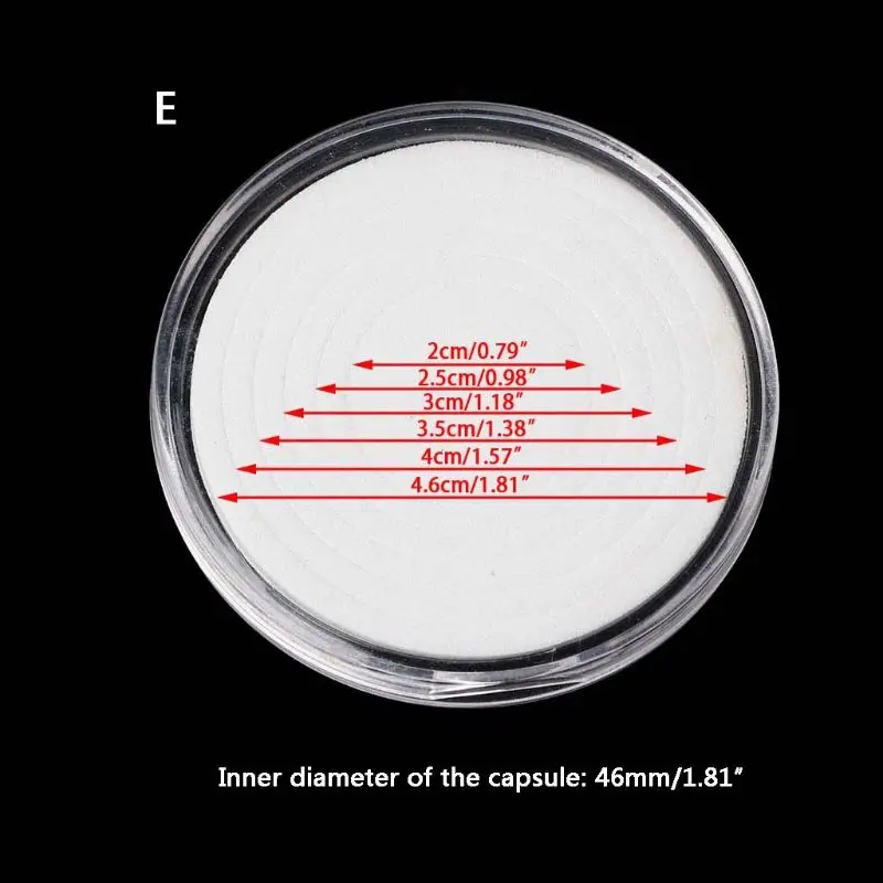 Round capsule of the 46 mm inner diameter and pad rings with 5 different inside diameter, make this coin holder fit 6 different diameter coins.
