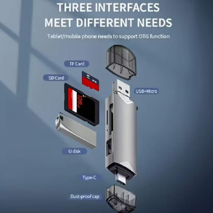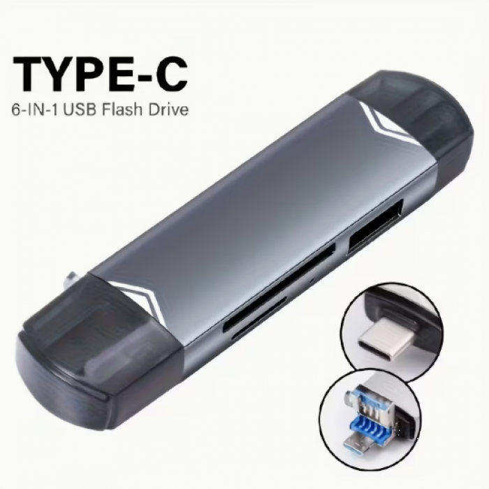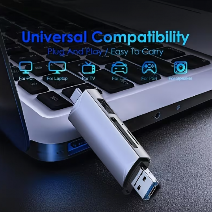 The 6-in-1 SD Card Reader is a versatile and compact solution for transferring data quickly and easily between your memory cards and multiple devices. Designed for photographers, videographers, and everyday users, this multi-interface card reader supports SD and TF (MicroSD) cards and works seamlessly with Android smartphones, cameras, laptops, and desktop computers.