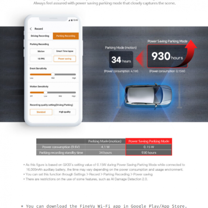 The FineVu GX33 Dual FHD Dash Cam is an advanced two-channel vehicle recording system designed for maximum safety, clarity, and long-term parking protection. Equipped with SONY STARVIS sensors, AI Damage Detection 2.0, and Power Saving Parking Mode, the GX33 delivers reliable performance both while driving and when parked for extended periods.