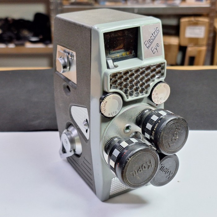 The Electric Eye system automatically measures available light and helps adjust exposure for more accurate filming, making it easier for users to achieve properly exposed footage. Combined with its compact metal construction and high-quality optics, the camera represents the innovation of mid-20th-century analog cinematography.