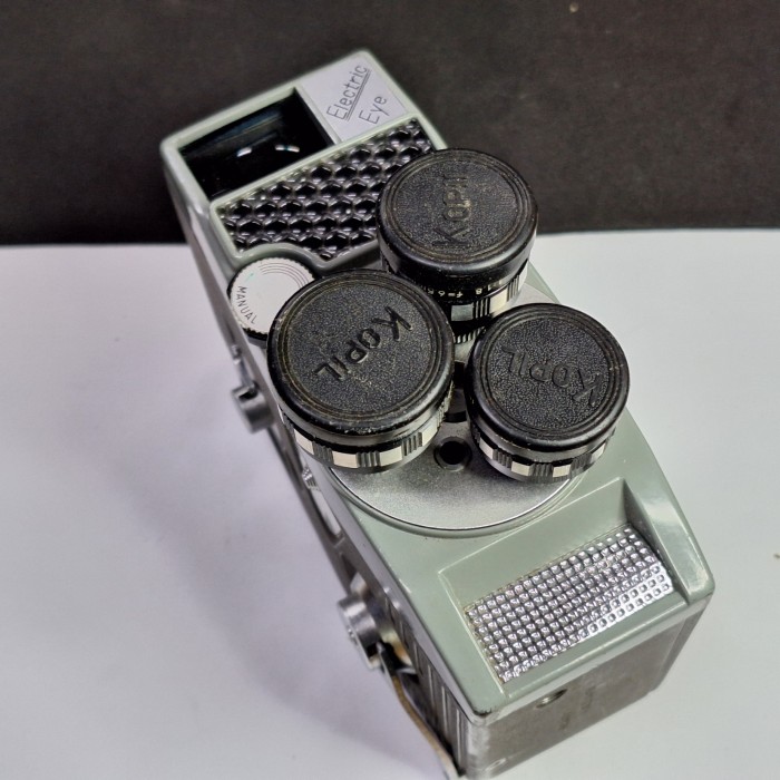 The Kopil-AI Electric Eye is a classic 8mm cinematic movie camera from the golden age of home filmmaking. Built with precision Japanese engineering, this camera allowed filmmakers and families to capture moving images on film with reliable automatic exposure technology.