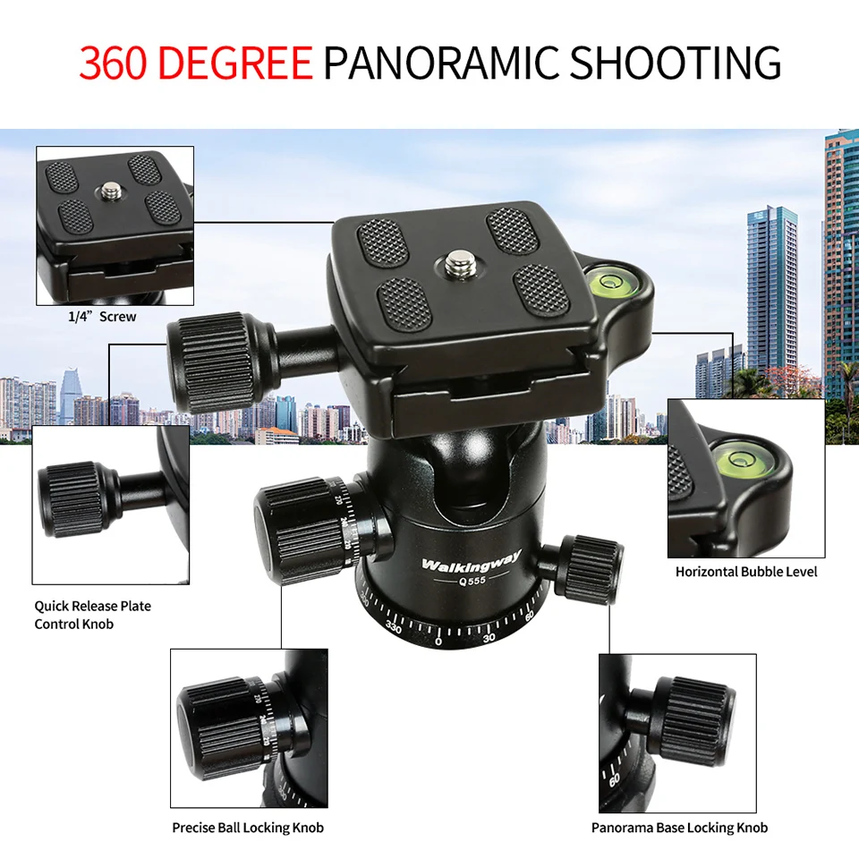 Universal ball head design with 3 lock knobs and 360 degree panoramic panning dial,suitable for horizontal panoramic shooting.
